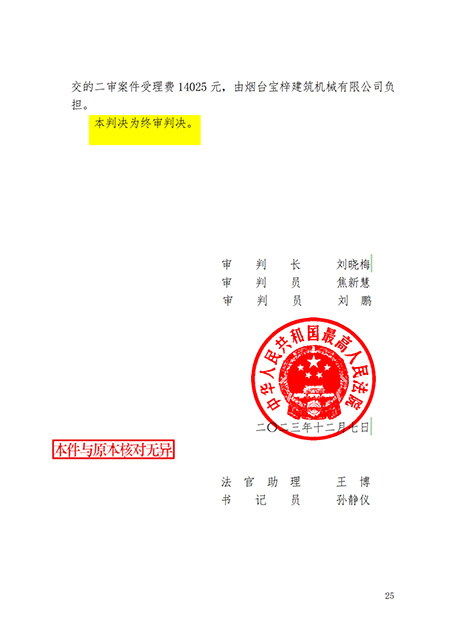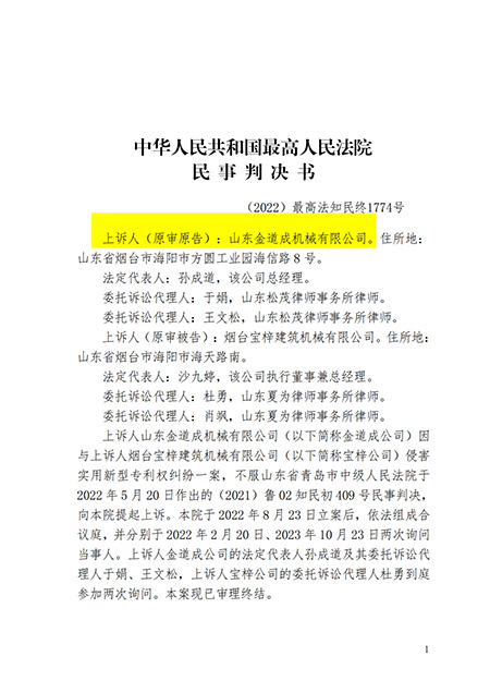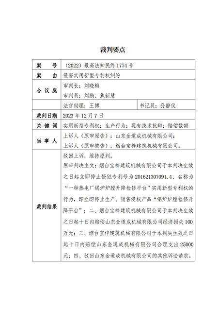 山東金道成機(jī)械有限公司于2021年11月26日立案起訴煙臺(tái)寶梓建筑機(jī)械有限公司侵犯“鍋爐爐膛檢修升降平臺(tái)”的專利權(quán)一案,經(jīng)過(guò)一審、二審法院2年零11天的審查,于2023年12月07日,中華人民共和國(guó)最高人民法院做出(2022)最高法知民終1774號(hào)的終審判決: