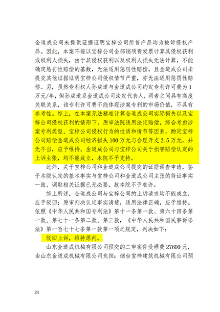 三、煙臺(tái)寶梓建筑機(jī)械有限公司于本判決生效之日起十日內(nèi)賠償山東金道成機(jī)械有限公司合理支出 25000元。